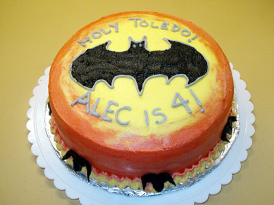 | A buttermilk chocolate cake with orange mousse filling and orange buttercream frosting. Recipes from The Perfect Cake, buttercream mixing from The Whimsical Bakehouse. The final installment in Alec's birthday. Lesson learned: "1. Do not turn the oven dial to Broil instead of Bake. 2. NEVER add gel coloring to chocolate ganache because it will curdle/seize and look disgusting." | My sister's traditional carrot cake with cream cheese icing. Made for a big birthday of Andrew's. Now all gussied up with basketweave. Can't say it's significantly more beautiful than the one show above with really simple and fast dots. |